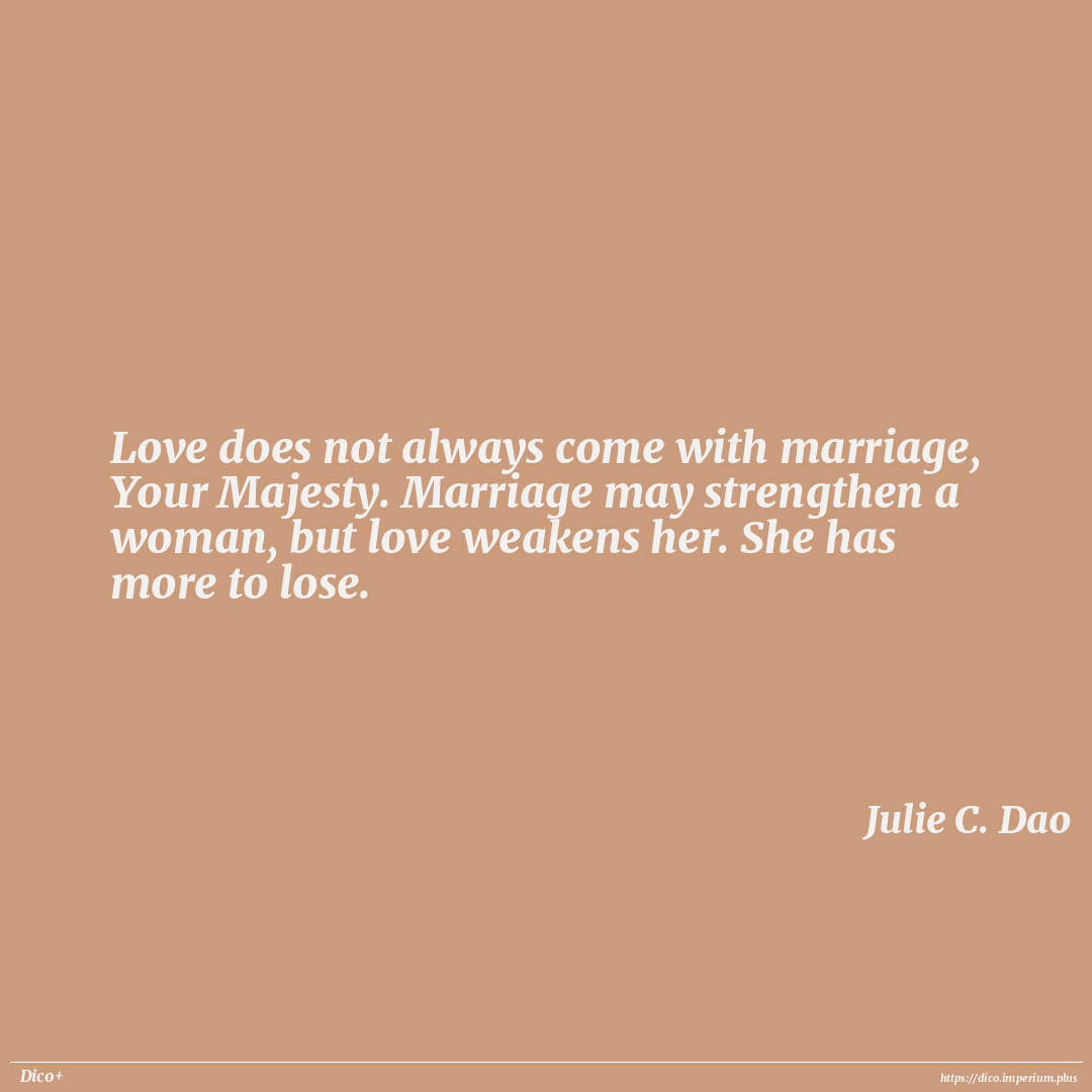 Love does not always come with marriage, Your Majesty. Marriage may strengthen a woman, but love weakens her. She has more to lose.