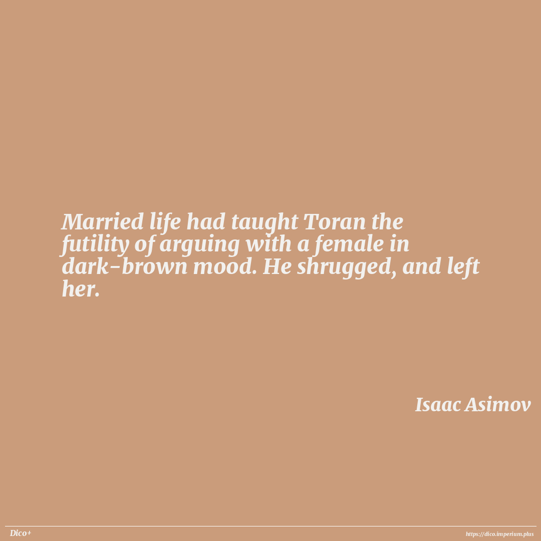 Married life had taught Toran the futility of arguing with a female in dark-brown mood. He shrugged, and left her.