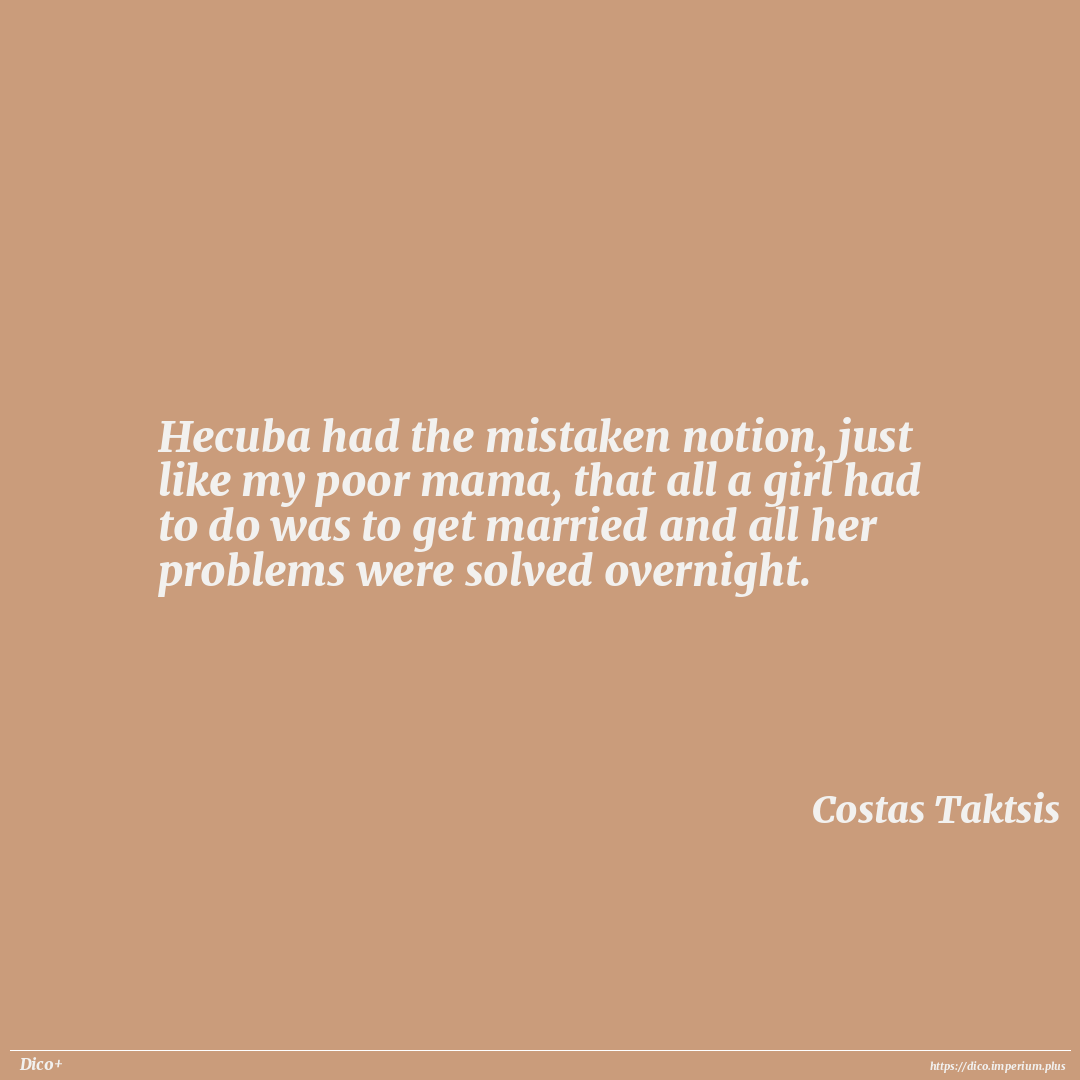 Hecuba had the mistaken notion, just like my poor mama, that all a girl had to do was to get married and all her problems were solved overnight.