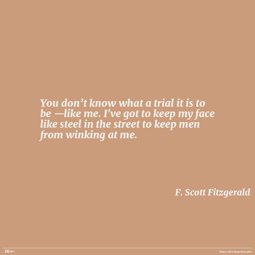You don’t know what a trial it is to be —like me. I've got to keep my face like steel in the street to keep men from winking at me.