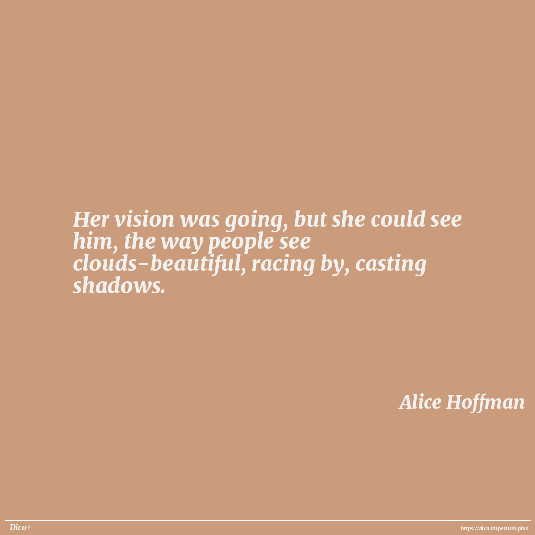 Her vision was going, but she could see him, the way people see clouds-beautiful, racing by, casting shadows.