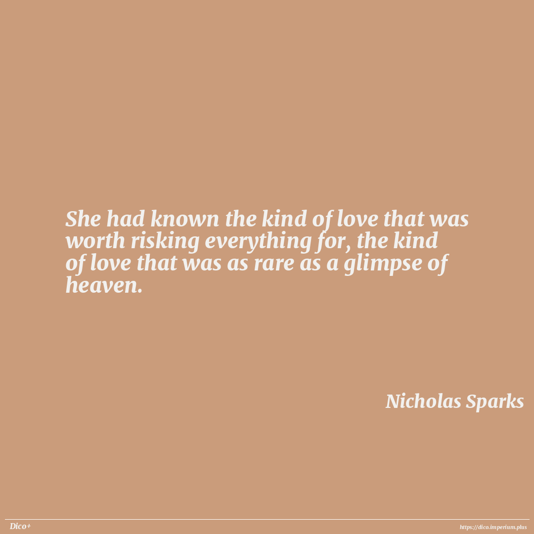 She had known the kind of love that was worth risking everything for, the kind of love that was as rare as a glimpse of heaven.