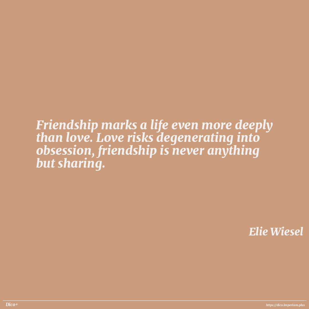 Friendship marks a life even more deeply than love. Love risks degenerating into obsession, friendship is never anything but sharing.