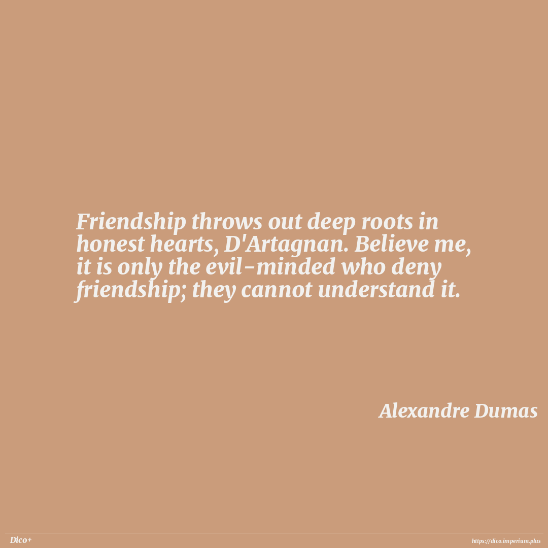 Friendship throws out deep roots in honest hearts, D'Artagnan. Believe me, it is only the evil-minded who deny friendship; they cannot understand it.