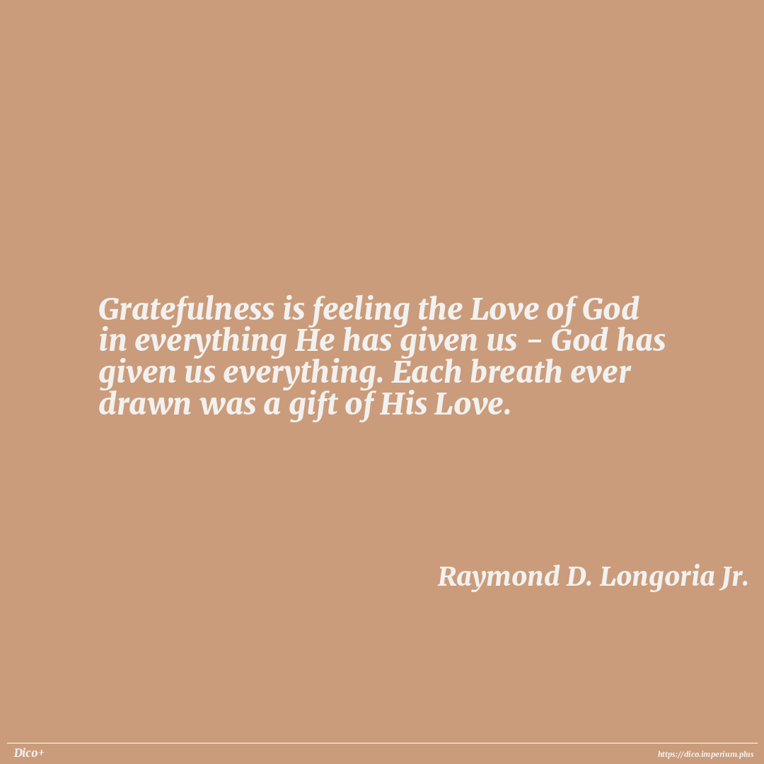 Gratefulness is feeling the Love of God in everything He has given us - God has given us everything. Each breath ever drawn was a gift of His Love.