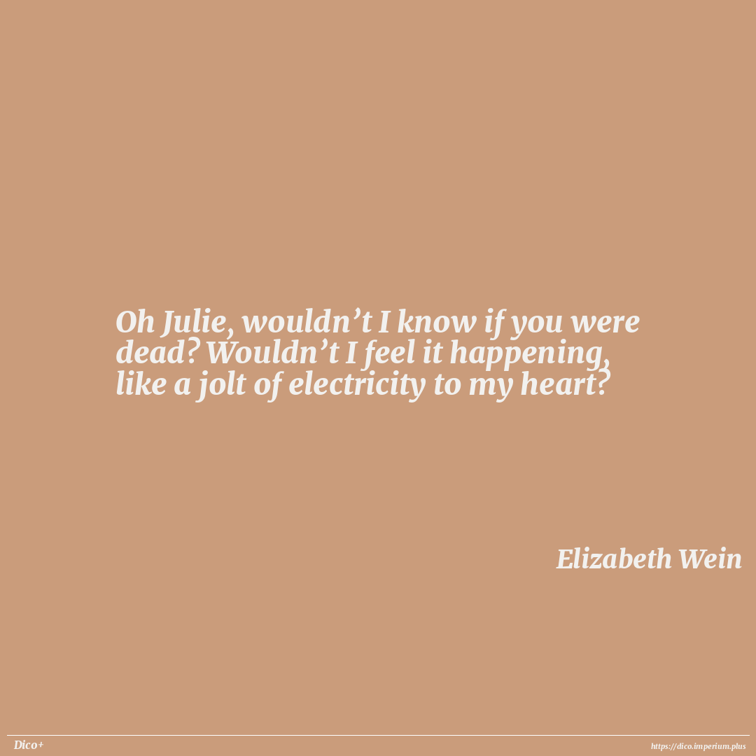 Oh Julie, wouldn’t I know if you were dead? Wouldn’t I feel it happening, like a jolt of electricity to my heart?